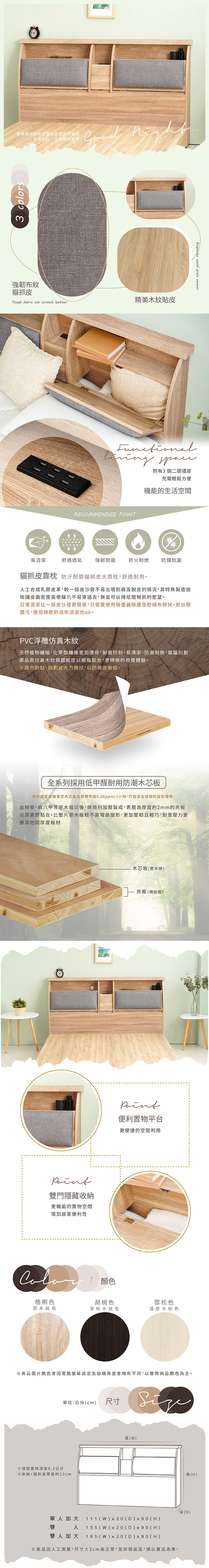 蜜絲 20cm收納插座貓抓皮靠枕床頭--雙大6尺