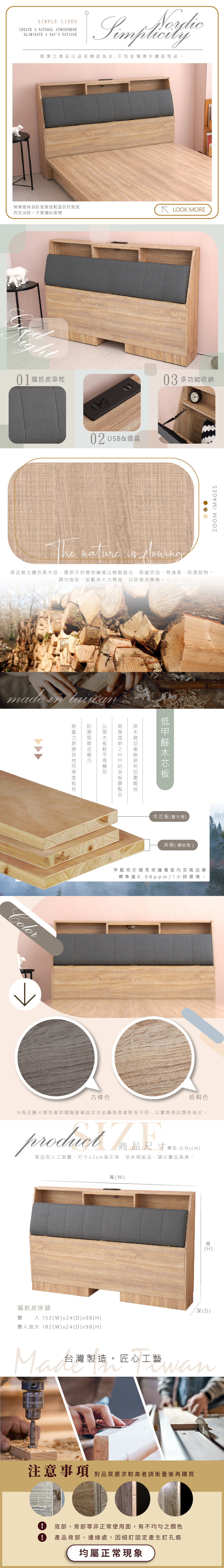 夏洛特 USB插座貓抓皮收納床頭-雙大6尺